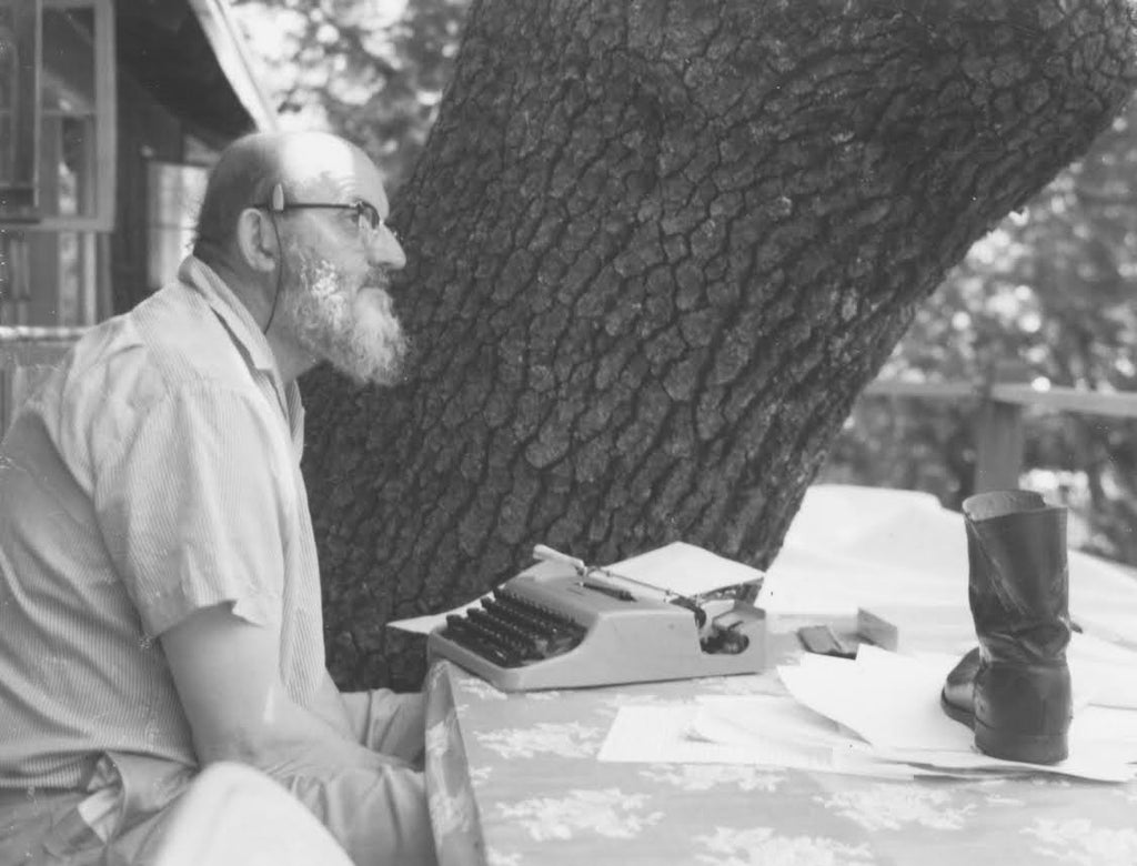 Ansel Adams at the family house with a typewriter. (Collection of Michael and Jeanne Adams)