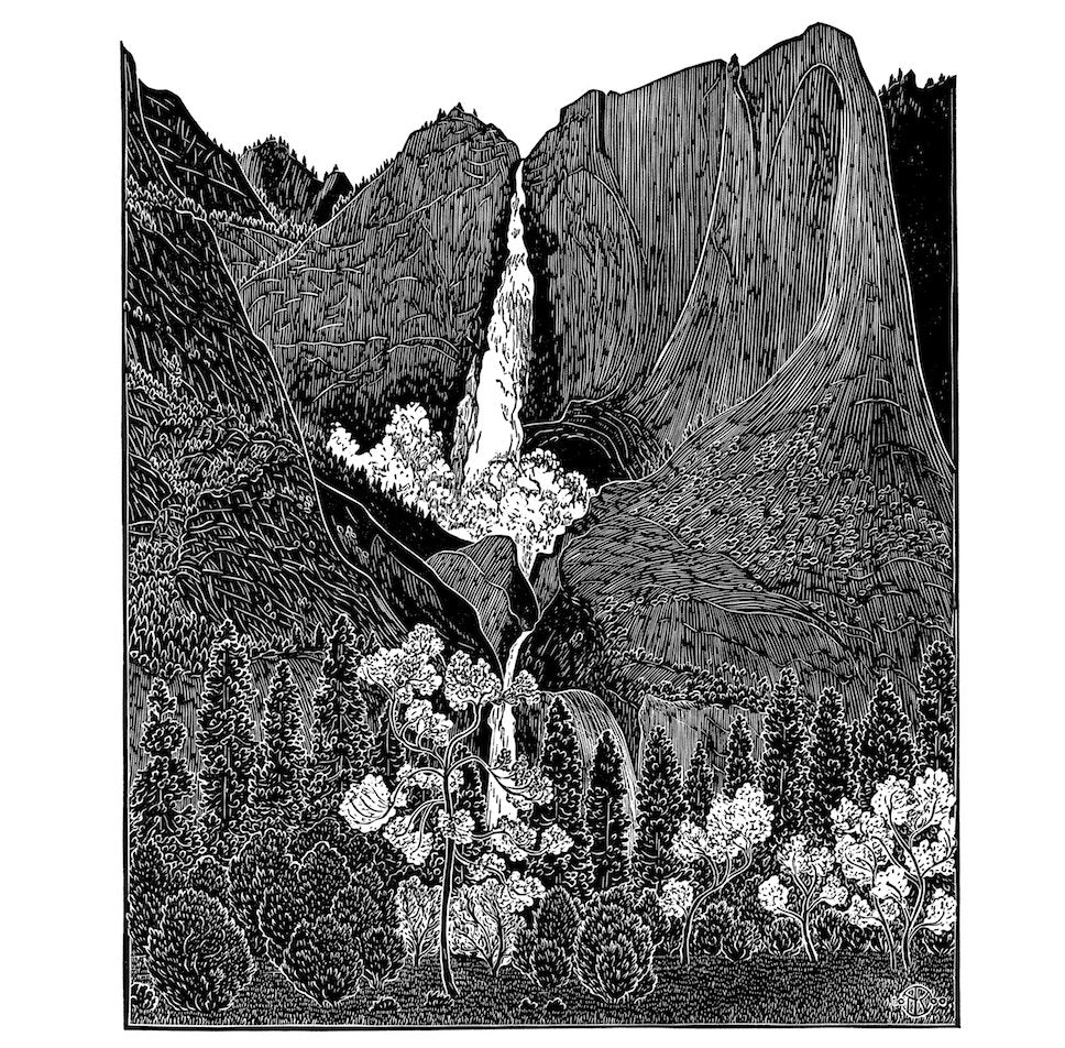 “For as long as I can remember I have spent part of every summer and a good many winter weeks in the Sierra Nevada. The magical landscapes and eco-niches of Yosemite have inspired my art, and eventually my Japanese-style woodcut prints, since my father first took me to the Valley in 1961. The Park and the whole range never ceases to provoke me to put pen and brush to paper. Five minutes walk from the pavement anywhere, in any direction, and the world is always new; a few hours or days hike from the trailhead and I am in a whole new universe of enchantment.”